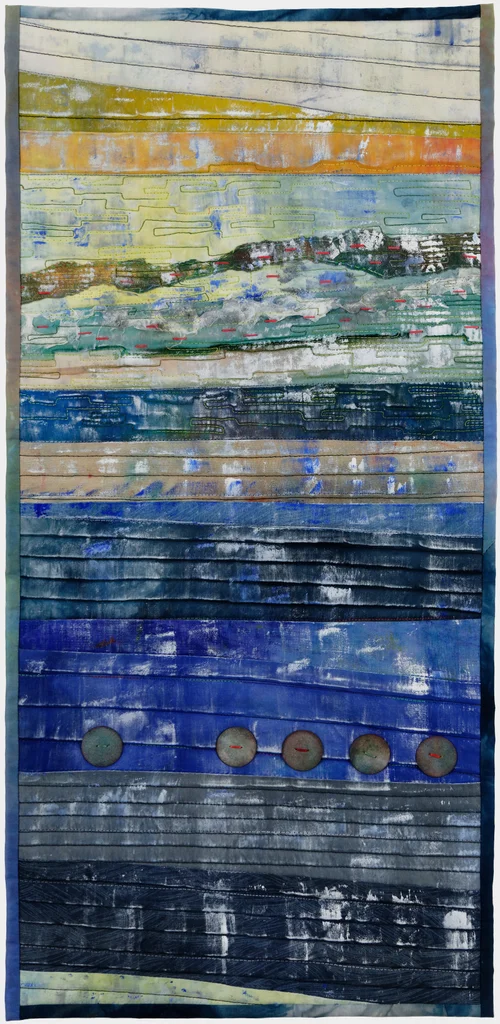 This is the first of four designs in a series that I have called ‘Tidal Landscape’. Each design depicts parts of boats hulls before they were cleaned and prepared for the next season. Peeling paint, barnacles and salt water result in wonderful colours and textures. Each piece was over-painted with acrylic paint after it was quilted. Size 12” x 24”.