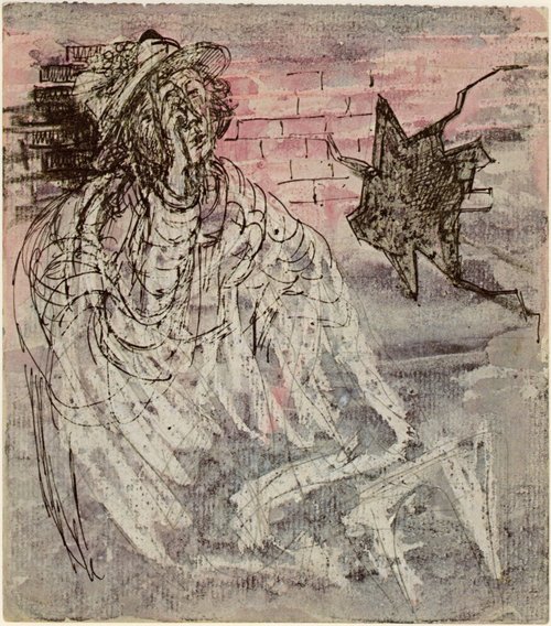 Two cloaked figures with others in background. Pen and black ink, with pink and blue-white wax crayon and watercolour.